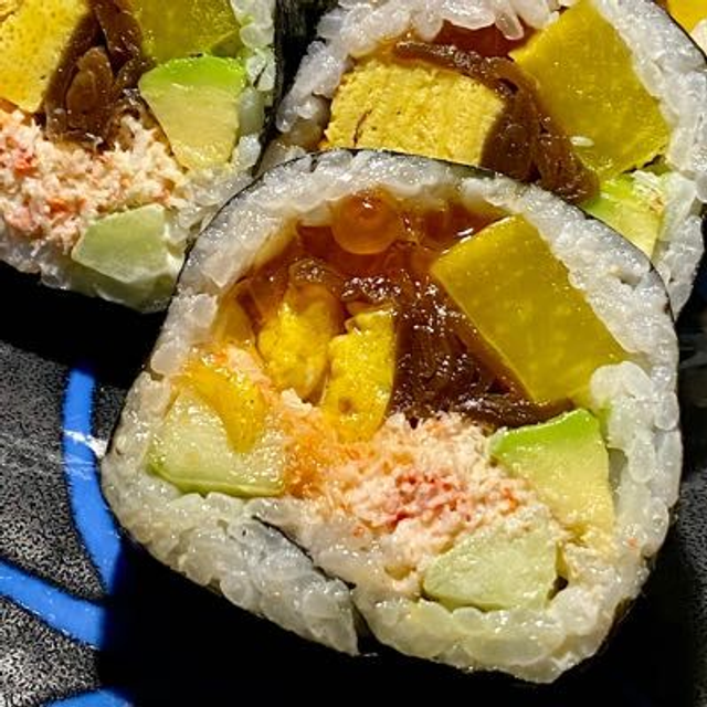 Uova di salmone,vera polpa di granchio,avocado,cetriolo,zucca giapponese,ravanello in salamoia,frittata.